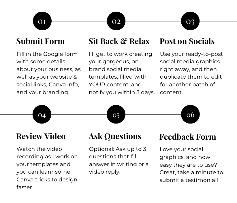 I'll review your submission, and within 3 business days I'll provide you with your customized branded Canva templates.