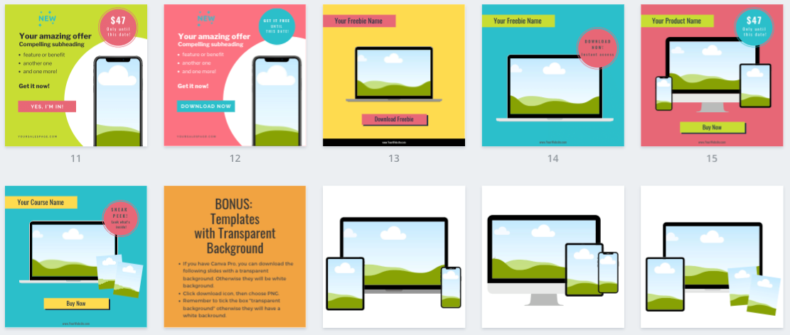 You can use the free version of Canva to edit the templates, and there are lots of free stock photos, design elements, and animated gifs for you to choose from, and of course you can upload your own photos! You'll be able to download the animated video mock-ups you create as static images (.png or .jpg) or as videos (.mp4).